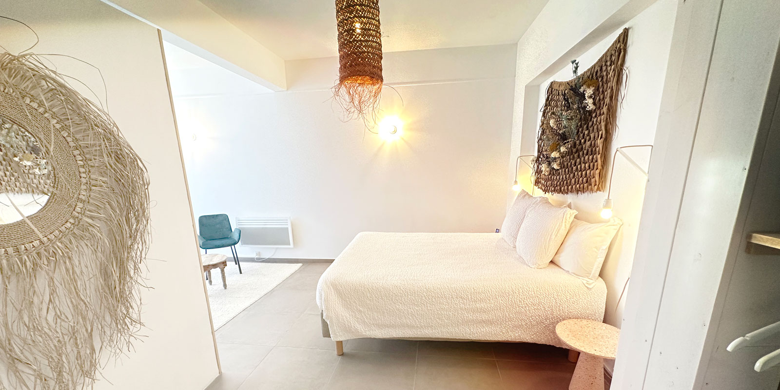 A generous 25m2 room, on the ground floor, close to the reception, decorated in a minimalist style, with a sitting area.